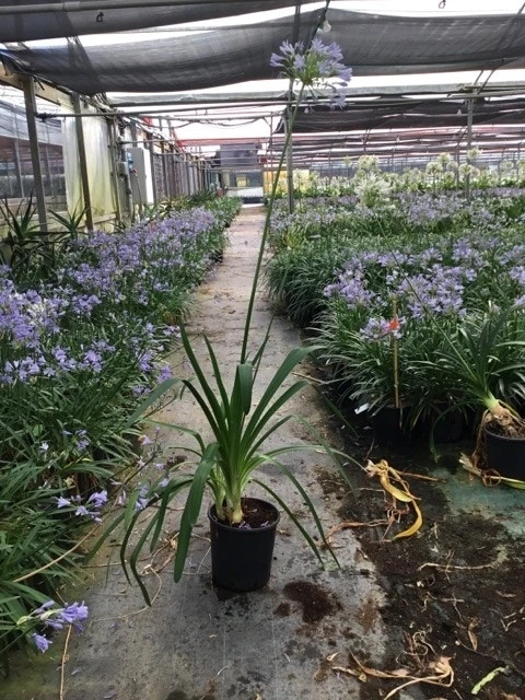 Agapanthus umbellatus ‘Ovatus’ (Afrikaanse lelie) bloeit met blauwpaarse bloemen op lange stelen. Deze Agapanthus bloeit zeer uitbundig. Agapanthus houdt van volle zon en heeft in de winter wel bescherming nodig.