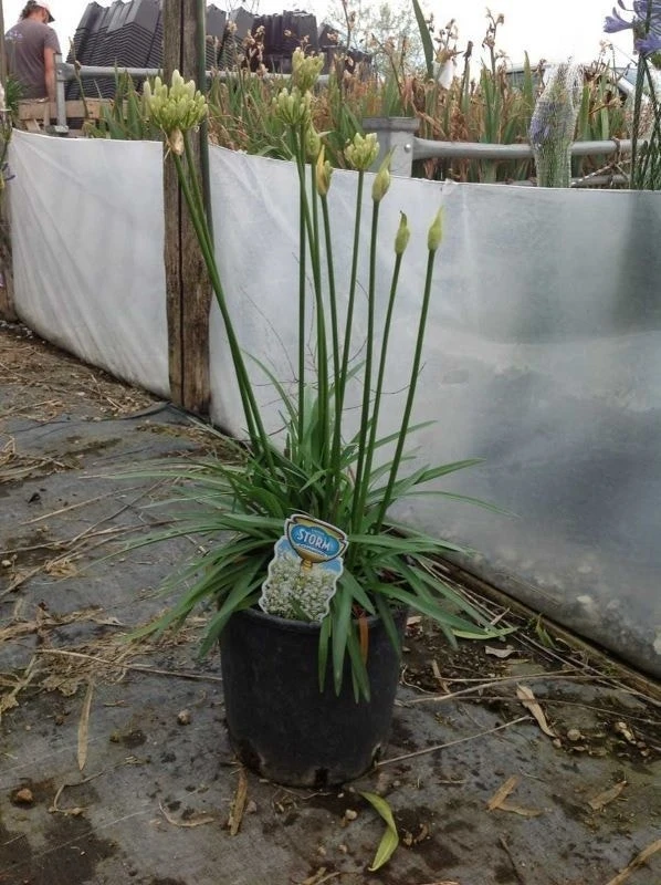 Agapanthus ‘White Storm is een Afrikaanse lelie met een rijke bloei. Deze Agapanthus bloeit zeer uitbundig en staat momenteel volop in bloei! Van juni tot september bloeit deze Agapanthus wit. Deze soort bloeit vroeger en rijker dan veel andere soorten, maar is niet volledig winterhard in Nederland, maar op een beschutte plek in goed doorlatende grond en wat bodemafdekking zal hij vrijwel altijd de winter overleven. Als de Agapanthus in potten of bakken staat kunnen deze in een onverwarmde of vorstvrije schuur of kas overwinteren. De bloemen zijn zeer goed als snijbloem te gebruiken.